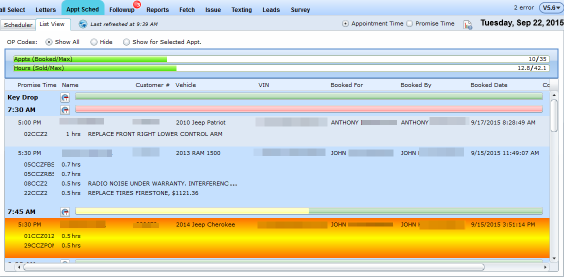 The columns display the Promise time (directly below the bolded Appointment Time as described above), Name, Customer #, Vehicle, VIN, Booked By, Comments and Booked date fields. Below those fields, and depending on the radio button selection, Op Codes can be displayed as described below: