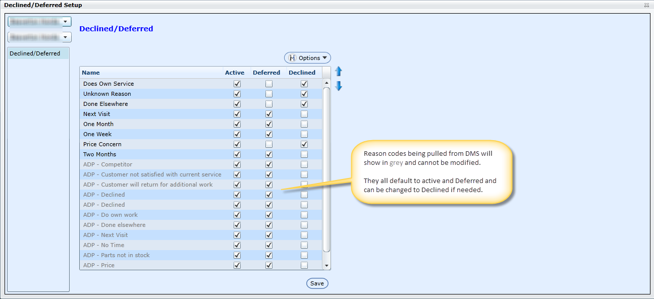 When booking appointments all recommended maintenance items can be accepted, declined or deffer-ed. Use the setup screen to customize all declined/deferred reason codes. All reason codes being pulled over from the DMS will appear in grey font and cannot be edited. DMS codes also default to Deferred and can be changed to Declined at anytime.Â