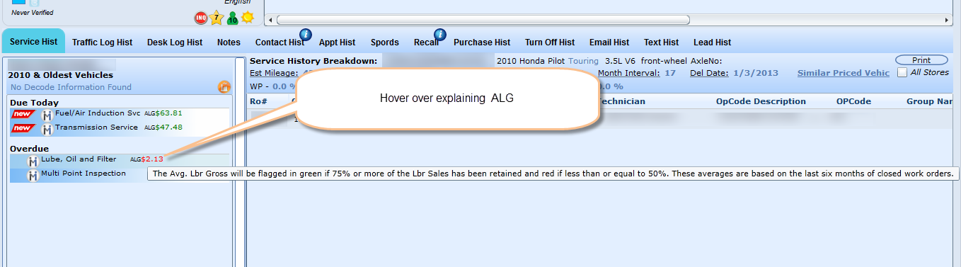 In the Recommended Maintenance section on the Profile screen we will the display the Avg Lbr Gross "ALG" to the right of each recommended service. This will help the Appointment Coordinators know which services are most profitable for the dealership. Â
