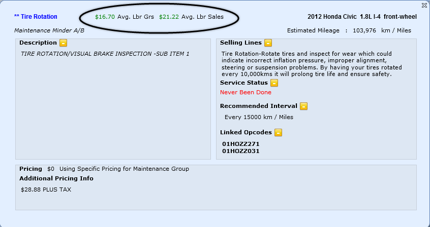In the Recommended Maintenance Popup we will display the Avg Lbr Gross and Avg Lbr Sales for that Recommended Maintenance at the top of the pop up screen to the right of the Maintenance name.Â