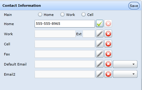 When adding in the phone numbers for Home, Work, Cell or Fax you must click on the Edit Pencil it will turn to a green Check, enter in the info and then click on the Green Check to save.