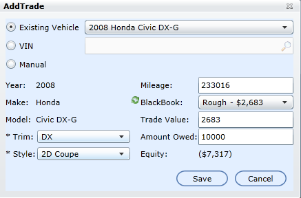 Existing Vehicle - By default radio button Existing Vehicle is selected. To select one of the customer's existing vehicles on file, click the drop down, and select the vehicle. The bottom of the screen populates with the vehicles information: Year, Make, Model, Trim, Style, Mileage, BlackBook (which contains the choice of three selections: Rough, Average or Clean), Trade Value, Amount Owed and Equity;Â from these fields, the following can be adjusted: Trim, Style, Mileage.Â