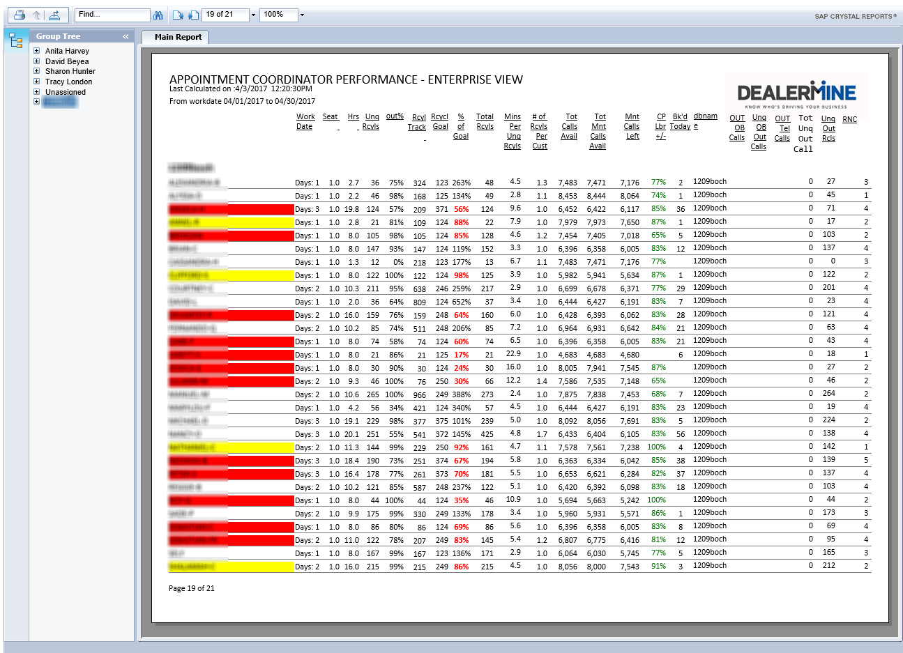 This report allows you to compare your Service Appointment Coordinators to those in our DealerMine BDC location.