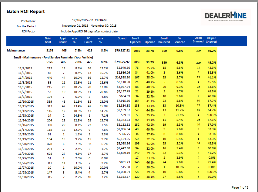We have created a new batch ROI report to track the successes of your batch contacts being made through letters and/or emails. By default we will include all Appts/RO's that have generated within 30 days of the contact date. This number is customizable and can be changed to any value.