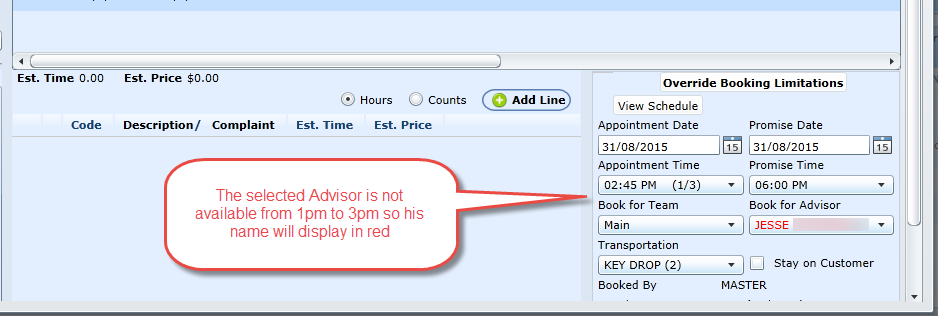 When an user is booking an appointment for an Advisor that is not scheduled in for the date and/or time being booked for we will display the Advisor name in Red in the "Book for Advisor" drop down. The scheduling info will be take from the schedules entered in Advisor Setup along with time off entered in Vacations/Exceptions. We will not prevent the appointment from being booked, only notify the booked by user by flagging the Advisor's name in Red that there could be a booking issue if the customer specifically wanted to book with that Advisor