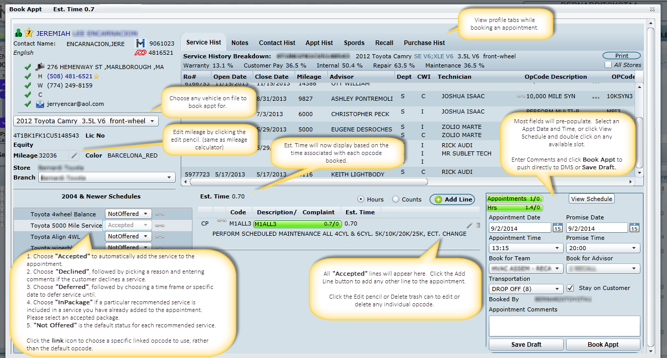 Have viewing access to seven history tabs, which up until now were only visible on the Profile. (Service Hist, Notes, Contact Hist, Appt Hist, Spords, Recalls, and Purchase Hist)