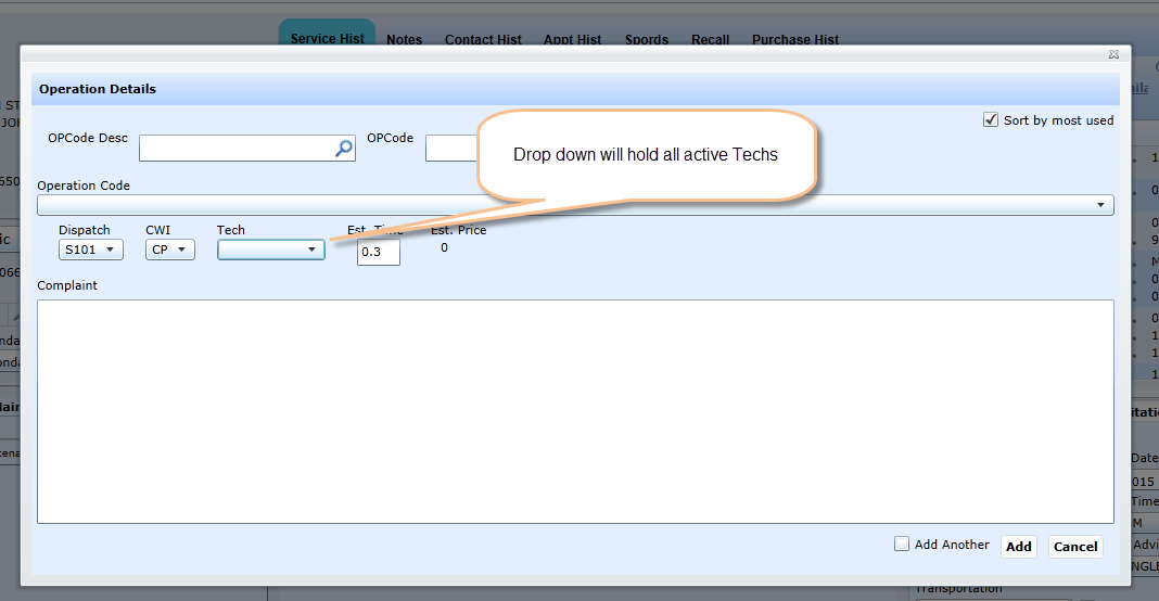 When clicking on Add Line on the Book Appt Form, the user is now able to assign a Technician to any opcode for ADP, ERA and ARK Dealerships as well now. This can be done in Store Specifications we have added a "Push Tech # on Appt Line" when check the Tech drop down will display on the Operation Details screen.