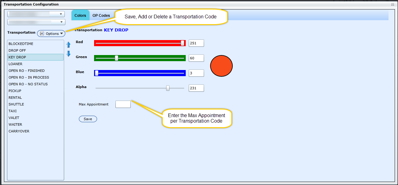 Enter a Max Appointment per Transportation Code. This count displays on the Legend on the Appointment Schedule. Entering a number here also displays a count on the drop down for Transportation Type on the Book Appointment Form; the number on the drop down represents how many appointments have been booked for the selected transportation type for the selected day/time. Note: This doesn't actually stop the user from over booking for the selected transportation, it only displays a count of how many appointments for the selected day/time have been booked for the selected transportation type.