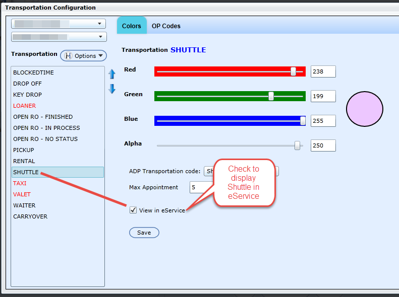 To offer Shuttle service for customer that are booking appointment through eService a user with Shuttle selected can simply place a check in the "View in eService" check box and Save.Â