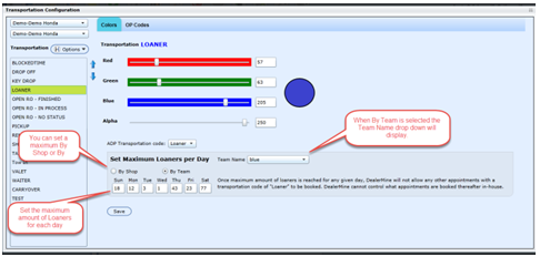 Now in Transportation Configuration the Transportation Code "Loaner" can be set with a maximum per day, By Shop or By Team for appointments being booked with the transportation code "Loaner". Choose either "By Shop" or "By Team", depending on how your Service department operates, and set the appropriate max # of loaners per day. When the maximums are set and saved and the amount of Loaners has been reached on any given day DealerMine will not permit any other appointments to be booked with a transportation code "Loaner" see Book Appt.
