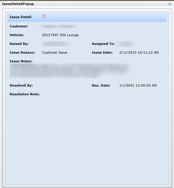Issues in Contact Hist - When a user needs to view the details of an issue they can simply go in the customer's Profile and on the Contact Hist tab right click on the issue, a IssueDetailPopup will display showing all the information on that issue.