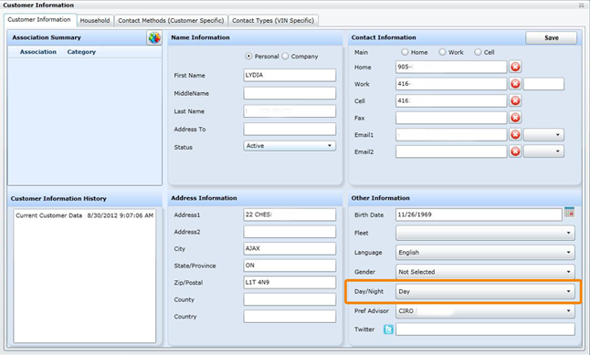 The DealerMine application has a prompt in the "Customer Information" screen called Day/Night. This drop down allows the user to drill down on customers with requests to be contacted either at night or during the day. For example, in the database you might have 100 customers that prefer to be contacted at night. Therefore, for every customer that is due for a certain type of call on the Call Select Screen, you can drill down and specifically target customers based on their Day/Night preference. This was originally created in order to accommodate customers that do shift work, and would prefer to be contacted at night, so that they are not interrupted while they are sleeping during the day.