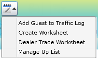 The DealerTrade Worksheet can be initiated by clicking the "Add Guest to Traffic Log" action button and clicking Dealer Trade Worksheet in the drop down as shown here. The Dealer Trade Worksheet allows you to quickly create a printable form capturing any Dealer Trades (incoming and outgoing) between your dealership and any dealerships you do dealer trades with.