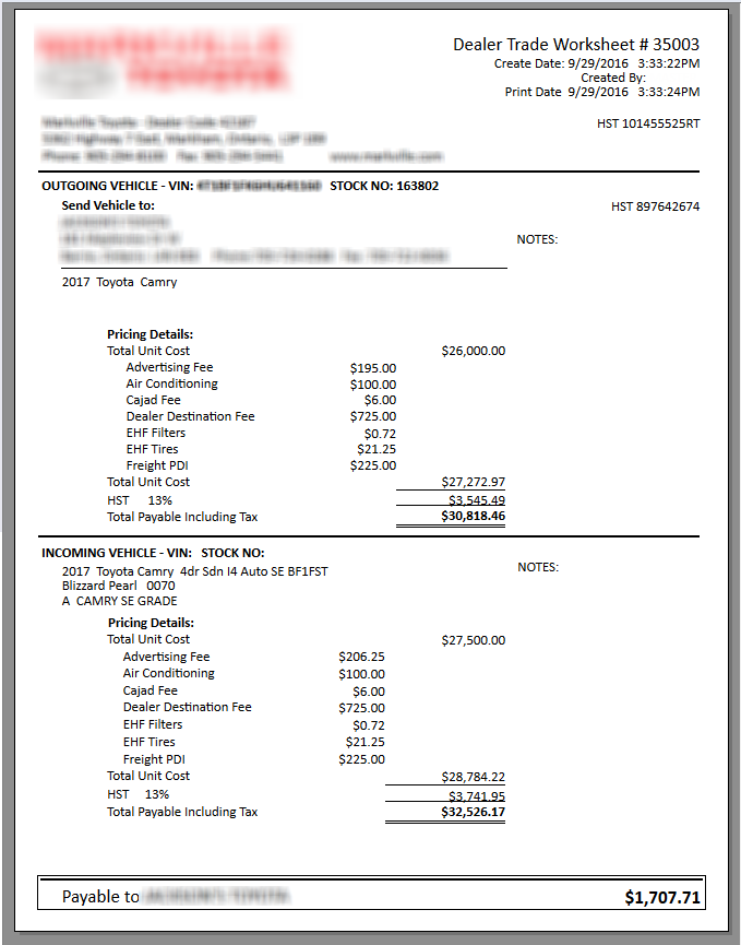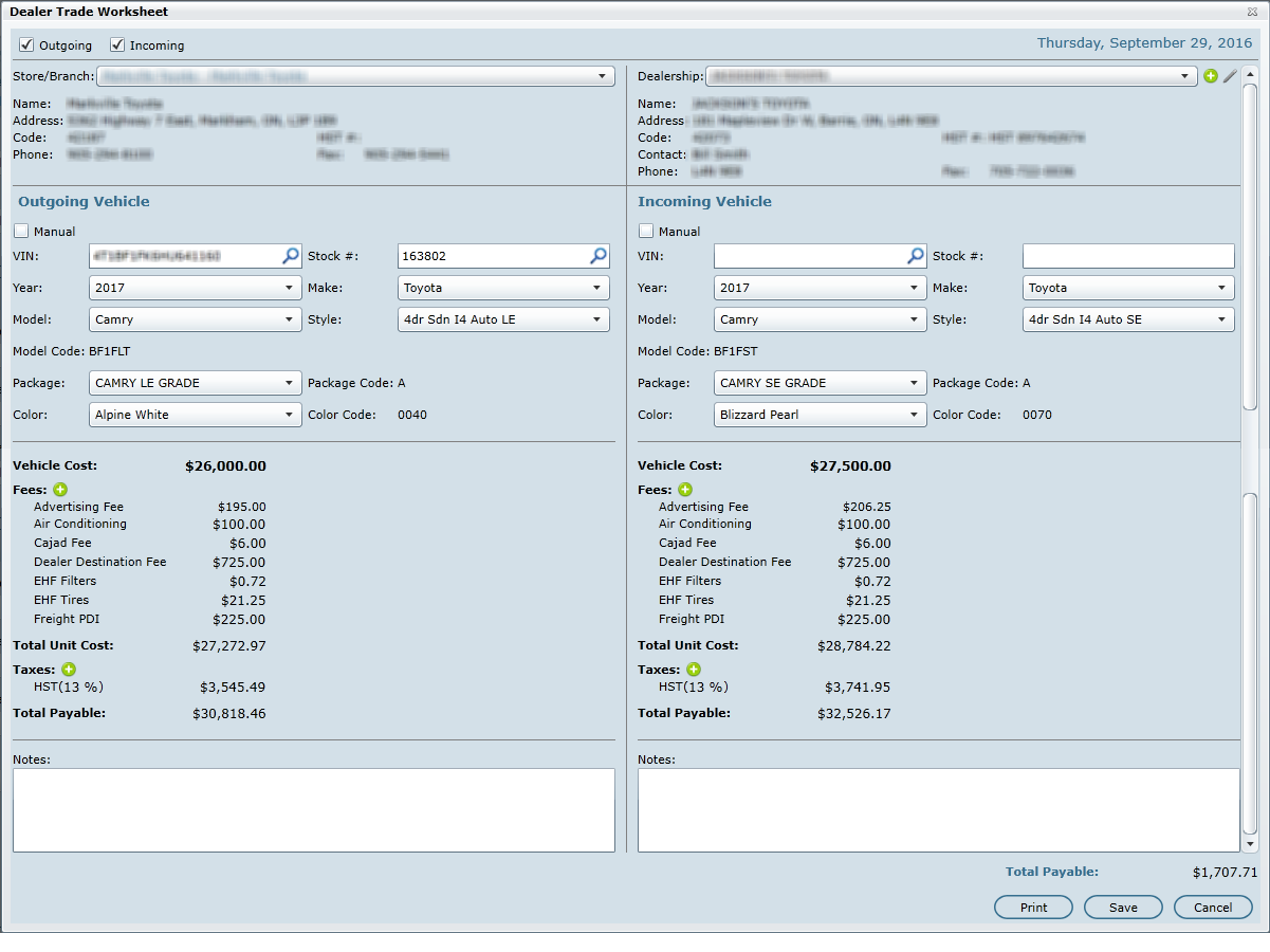Notes can be entered as well which will print on the Dealer Trade form.