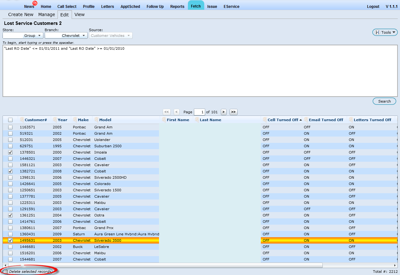 While in Edit mode you can check off multiple records that you'd like to delete from your query, while skipping from page to page. When ready you are ready to delete, click the "Delete selected records" button found at the bottom of your screen. This will permanently remove all records from your query, unless you choose to include them again by using the "Show deleted records" option under the Tools menu.Â