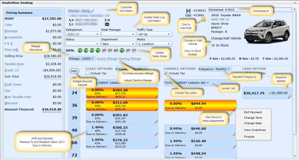 Our one-click Desking screen opens automatically, displaying 15 + payment options instantly.  Incentives can be automatically applied for lease, finance and cash or must be applied manually. See Desking Configuration for more details.
