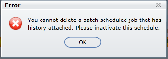 Now a user is not permitted to delete Batch Email Schedules if they have already ran and Contact History exists, they will only be permitted to delete a Batch Email Schedule that has not yet been sent. When a user tries to delete a Batch Email Schedule that has ran and Contact History exists, DealerMine will display an Error message letting the user know they cannot delete. The user can then inactive the Batch Email Schedule by clicking on the Green check mark on the grid which will stop it from running.