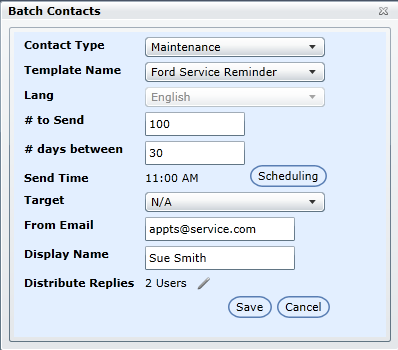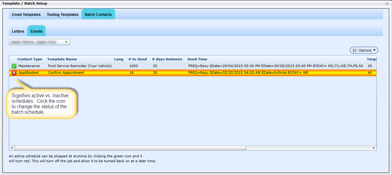 Batch Emails can be setup to send out for Appt Booked, Confirms, CSI, Maintenance and No Shows and the contacts will pull from the daily contact list; meaning they must be due for specified contact type in order to qualify to receive a letter.  Batch emails are most commonly setup for all contact types to help aid your BDC to get through the contacts that are presented daily.Â