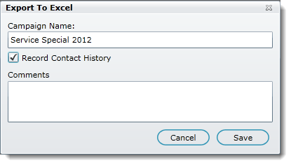 Check the box to Record Contact History. (optional) A comments box will appear where notes can be entered which will be saved in Contact History for all vehicles included in this campaign. You can choose the location in which you'd like to save your excel file on your own personal computer. Once saving is complete, you will remain in Fetch viewing the current query results.