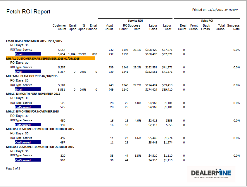 Fetch ROI will track the success of all Fetch Campaigns tracking work orders closed or deals sold in your Showroom, based on the ROI selection saved when launching the campaign. Only customers who exist in DealerMine with a VIN and a customer number will be included on this report. We track RO #’s and Deal #’s after the contact date for all campaigns to clearly show you in report format the outcome of each marketing campaign. The ROI Report defaults to 30 days.