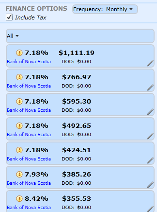 The finance list will now default to "All" lenders as opposed to only showing one at a time. This comparative view allows you to see which payment has the best payment, best gross, best rate or best incentive overall without a lot of leg work.Â