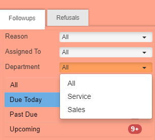 In Beehive a user by default will now have access to see both Service and Showroom Followups from the Followup tab on the Profile scree. There will be Dept drop down where by a user can filter to see only Service, Showroom or All Followups. To restrict access for a user go to the Admin screen - User Setup - User Access.Â