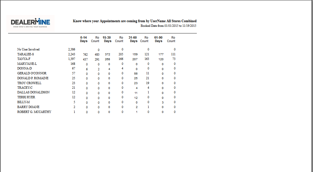 The inbound and outbound still uses the 14 day rule that Dealermine works from. But in order for the user to get credit for generating the business the last activity has to have been performed within 30 days prior to booking the appointment. If an appointment was booked and there is no previous recycle in 30 days then the system will assign the username "No User Involved"