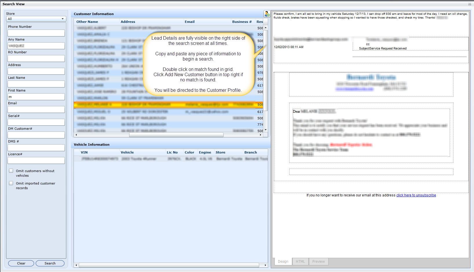 Double click on any new lead and the search screen will appear allowing you to view details and search based on any key piece of customer/vehicle information found in the lead details such as email, name, phone # etc.