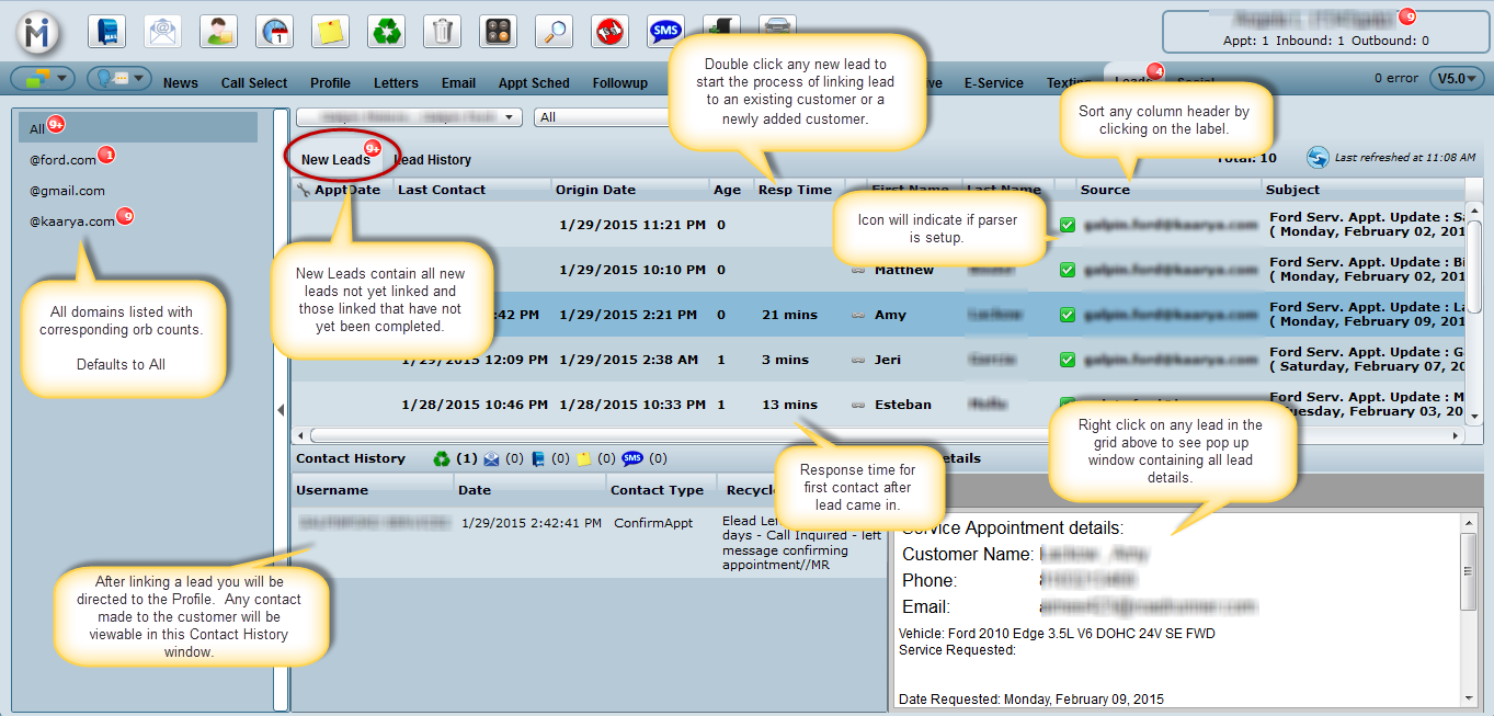 All leads are organized by domain on the left hand menu, per dealership and sort by most recent lead on top. The default view is All for the domains. Click any domain with a red orb to view those incoming leads. Single click on any lead to view detail in the bottom right, or right click on any lead to view details in a larger pop up window.