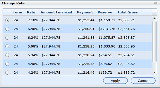 When the exclamation is clicked it will open a Change Rate popup, (shown below) which will display all the Term, Rates, Amount Financed, Payment, Reserve and Total Gross (for each rate the amounts will be different). The user can select the radio button next to the Term they would like to present to the customer, followed by clicking "Apply". The popup will close and the new Rate will be presented on the payment matrix. When a Rate or Term has been manually changed the changed Rate or Term will display in Blue in the popup making this easier for the user to see what has been changed.
