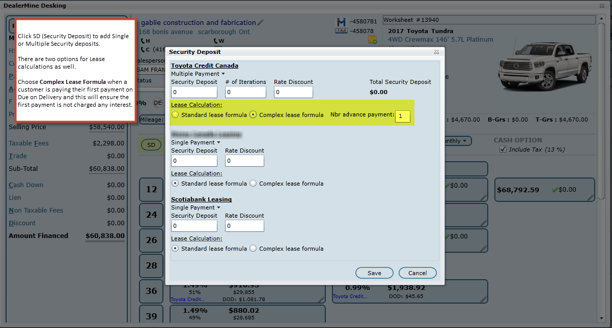When clicking on the Security Deposit button on the Desking screen, the popup will now display all Lease lenders that may offer security deposit options. Here the user will be able to select the Security Deposit option from the following: