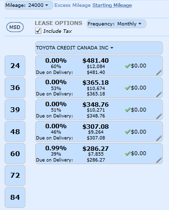 The payment matrix will automatically calculate all payments based on mileage, excess mileage, MSD's, Frequency and to include/not include tax. One lender will appear at a time, and another can be chosen using the drop down.
