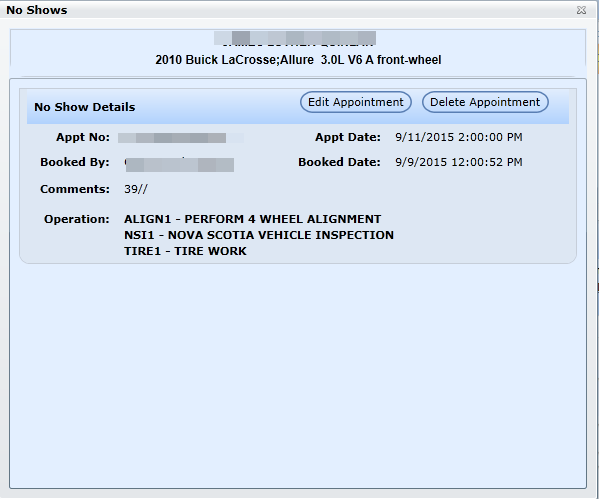 indicator displaying on the customer file at the bottom of the Recommended Maintenance section of the Profile screen. When the user clicks on the indicator it will open the No Show popup displaying all the details of the Service Appointment that was missed. In the No Show popup the user has the choice to Delete or Edit the appointment.