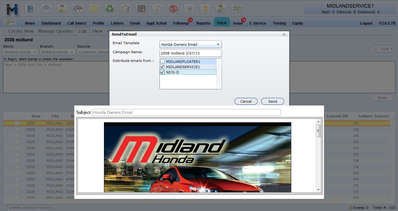 Distribute emails from: Choose any name to use as the send email, if more than one is chosen we will round robin. The DealerMine email account linked to the employee in the User Info tab or Store Access tab will be used as the Send Email.Â