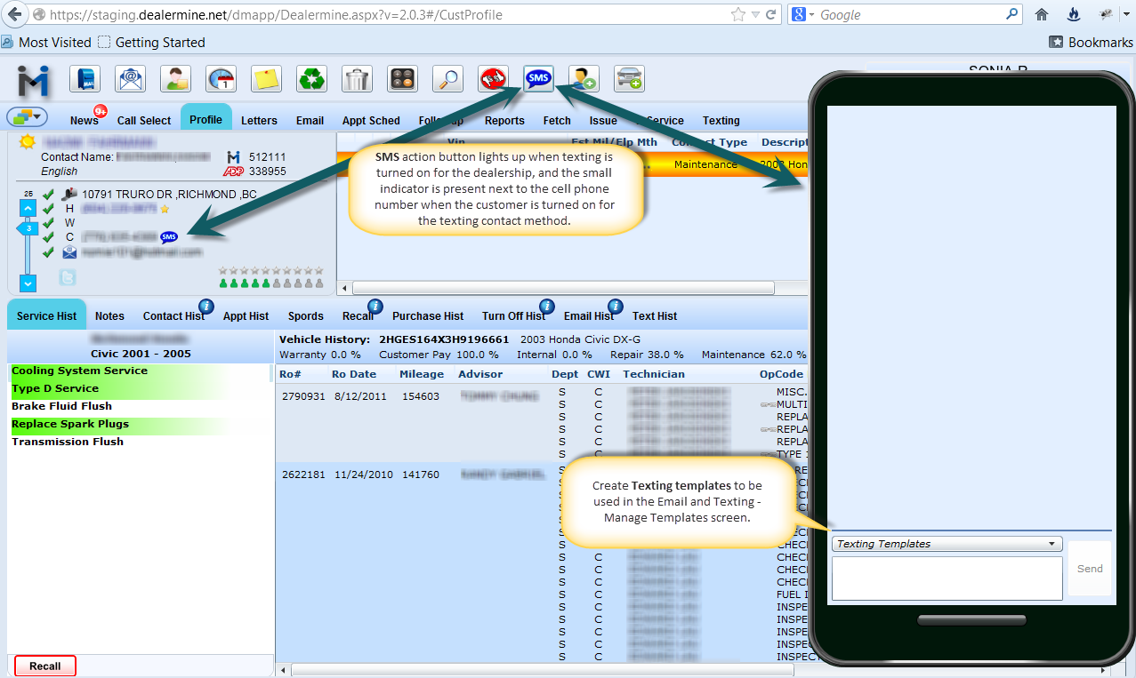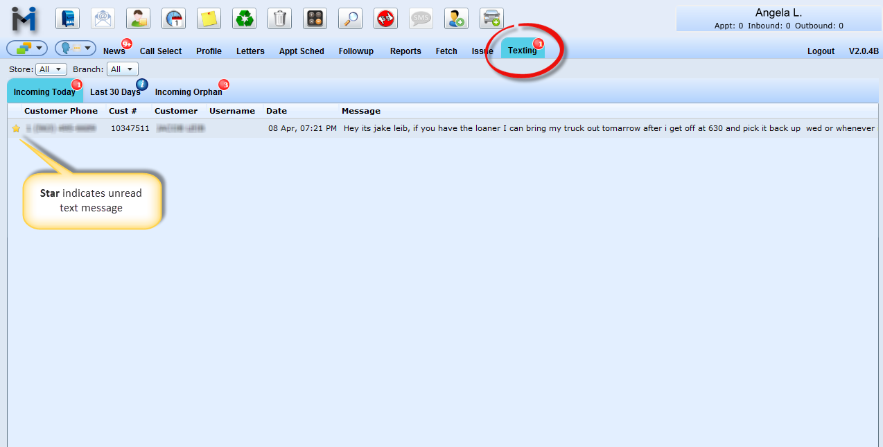 Incoming Today - the most recent incoming messages received today. From this tab, double click any customer to see the smart phone slide in to read the full conversation. Right click any customer to view profile. All unread texts have a yellow star to the right of the text. Unread meaning, unread by any DealerMine user since we have no idea of knowing if a text has been read by a customer.