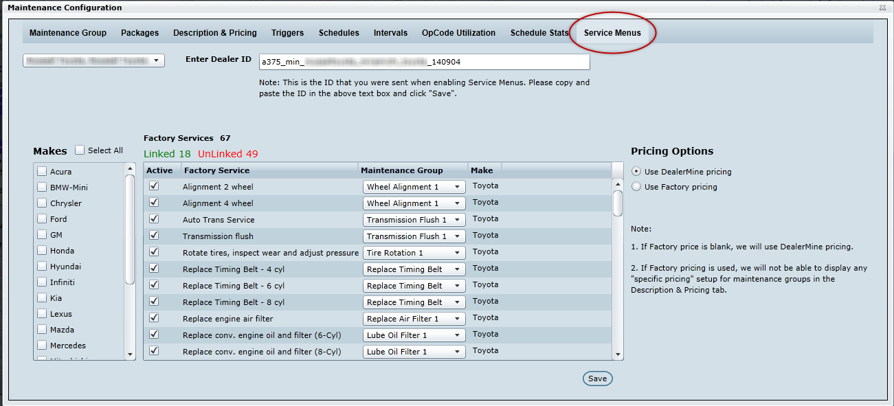 Minimum factory recommendations should be linked to a DealerMine maintenance group and activated in the Service Menus setup screen.