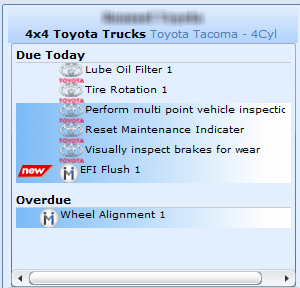 Factory Recommendations are flagged with a manufacturer logo (Ie. Toyota, Chrysler Ford etc.) and Dealer Recommendations are flagged with a DealerMine logo.