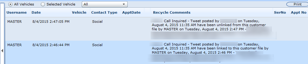 Now when linking a Social Lead to a customer file we will track and record who linked/unlinked the Tweet in the Contact Hist tab for future referencing purposes.