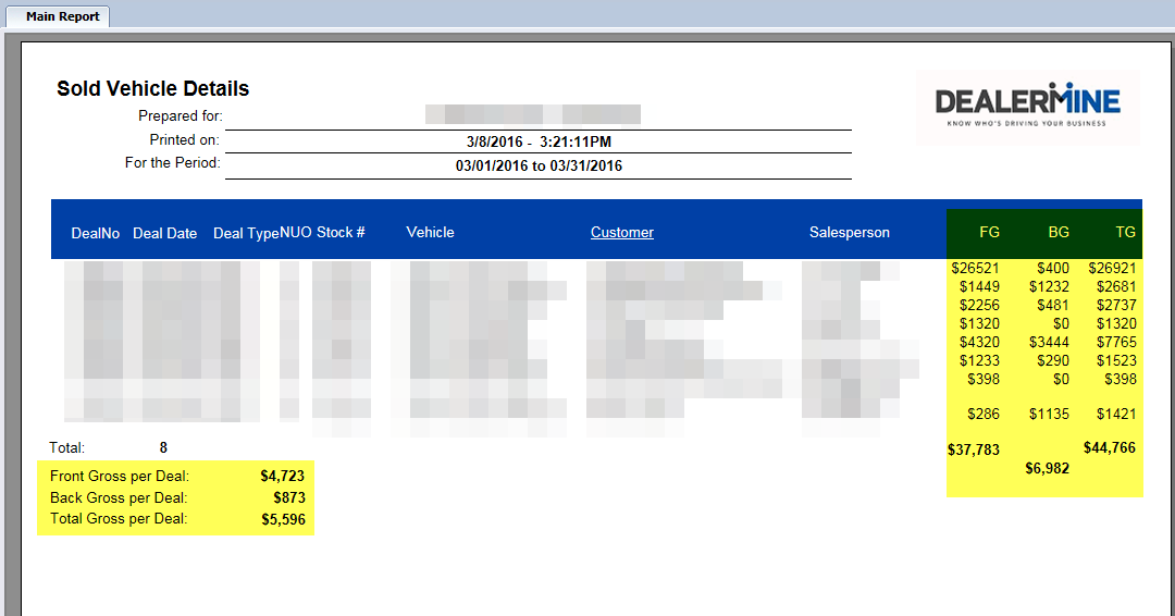 We have added Front Gross, Backend Gross and Total Gross to the Sold Vehicle Detail report with averages at the bottom. The Average lines will take the totals from the Front Gross, Backend Gross, and Total Gross and show the average for each, displaying as Front Gross per Deal, Back Gross per Deal and Total Gross per Deal.