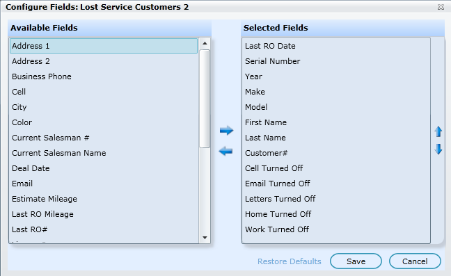 This screen allows you to control which fields you'd like to view in your query results. Choose any Available Fields and click the arrow to bring them over to the Selected Fields box. Use the up and down arrows on this side to control the layout from left to right.
