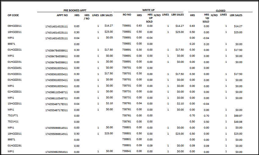 CLOSED - Hrs up sold, Hrs per RO, Lines and Lbr Sales.