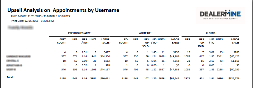 The left hand side will list all usernames set up in DealerMine that have booked appointments for the time frame being reported on.