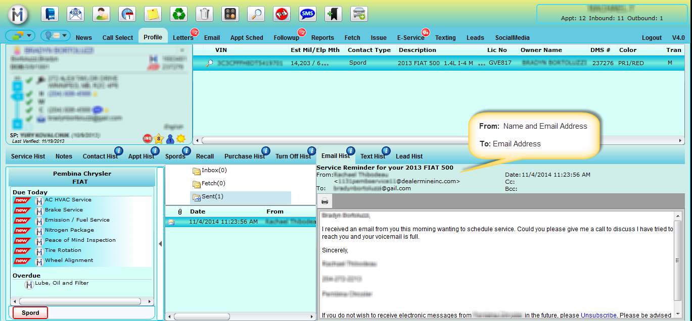'Sent' folders within DealerMine's email client you will be able to see the recipients email address and the email address it was sent from. This same valuable information will be displayed in the Lead Details within the Leads tab and also on the Profile screen > Email Hist for referencing purposes.Â
