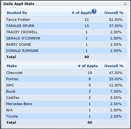 Daily Appt Stats:Â We have added Make to the bottom of the stats screen, now showing the daily appt counts based on the make of the vehicle.Â