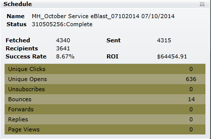 Once an Email Campaign is complete DealerMine will display a Statistics icon., to the left of the Campaign Name. Upon selecting the Statistics icon DealerMine will retrieve up-to-date statistical information for said Campaign from JangoMail (e.g. Campaign Name, Status, Total Fetched, Total Sent, Total Recipients, Success Rate, ROI, Unique Clicks, Unique Opens, Unsubscribes, Bounces, Forwards, Replies and Page Views). Â