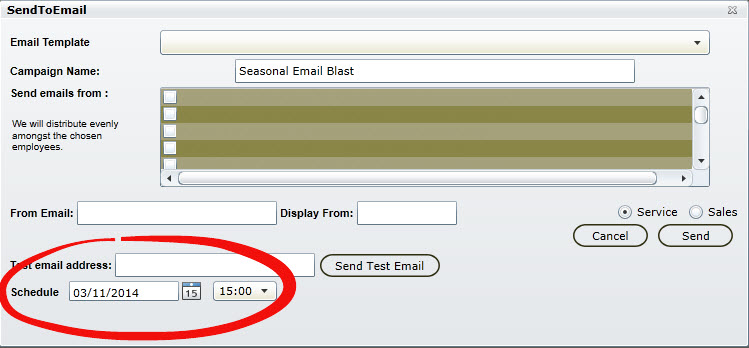 Schedule Email CampaignsDealerMine has now provided the ability to Schedule Email Campaigns whereby users can select a future Date/Time via the Tools > Contact Option (Send Email). Scheduled Campaigns will be presented under the Campaign's Tab, populating the Campaign's Schedule (Date/Time) column and presenting a Schedule Icon with the ability to re-schedule said Campaign., until the Campaign's Date/Time has elapsed. Â