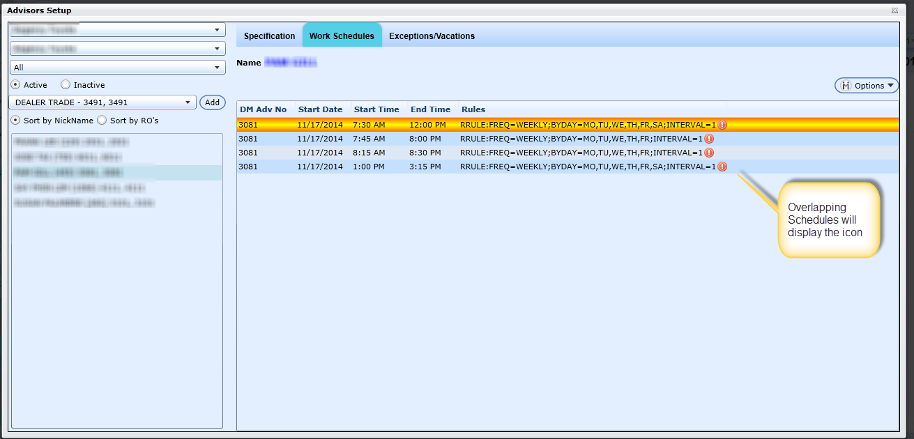 Advisor and Technician Work Schedule Overlap Warning