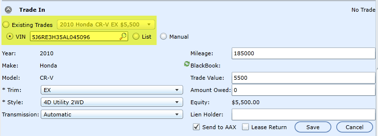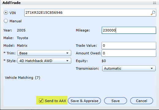 Remember to always check off the box next to Send to AAX / vAuto in order for this trade to be sent over for appraisal. If it is not checked off before being saved nothing will be sent. A trade can be edited and then pushed if this situation arises.Â