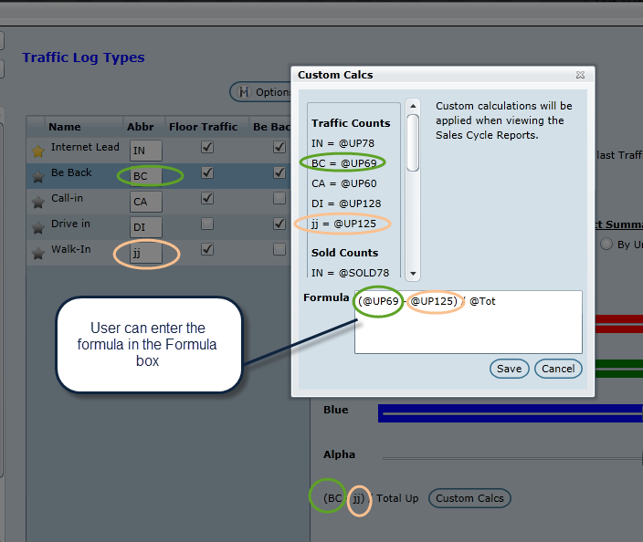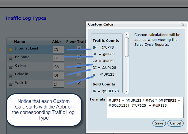 DealerMine will display the proper values in the formula, the abbreviation that is used to represent each Traffic Type will be used in the Formula and in the Read only list. When an abbreviation is changed the Formula and the Read Only list will update automatically. The Custom Calcs popup will display a read only Variable List and a formula textbox where the user can enter their custom formula base on that read only grid. There will be 4 headers in the read only Variable List starting with "@" then append the following word to it base on each header then append the record KEY on that.