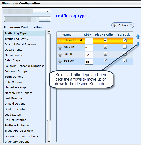 In Showroom Configuration > Traffic Types we have added arrows which will allow a user to set the desired sort oder for the Traffic Types to display when running the Sales Cycle Reports.